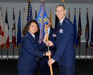 Col. Imelda Reedy, 14th Medical Group Commander, passes the 14th Medical Operations Squadron guidon to Lt. Col. Matthew Ostler, the new 14th MDOS Commander, during a change of command ceremony July 21 at Columbus Air Force Base, Mississippi. (U.S. Air Force photo/Melissa Doublin)