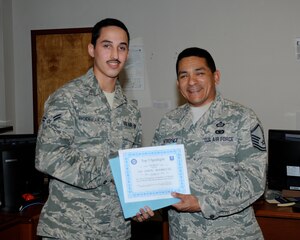 Airman 1st Class Jason Rodriguez, 14th Communications Squadron, receives a Top 3 Spotlight award certificate from Master Sgt. Samuel Gutierrez, Top 3 President, March 4 at the 14th Communications Squadron. One top performing Airman from Columbus Air Force Base is chosen monthly for the Top 3