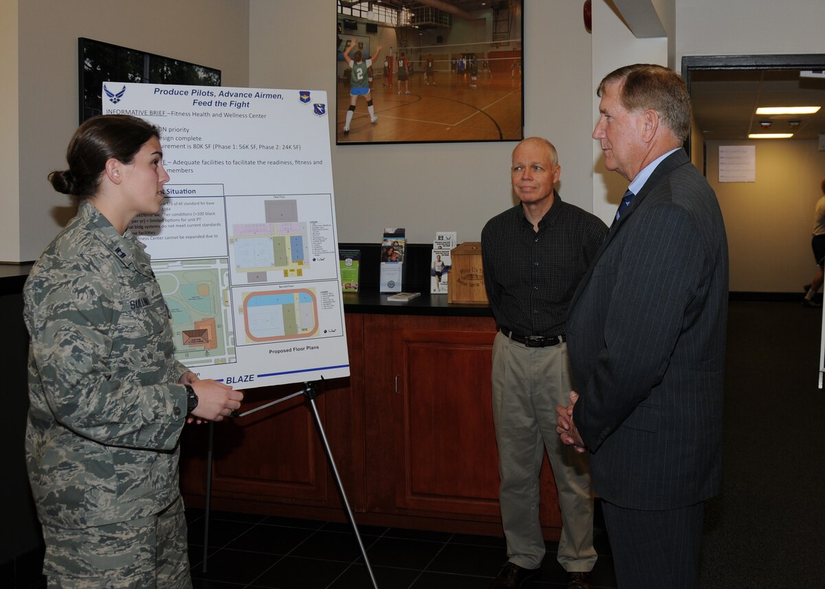 Capt. Jaclyn Sullivan, 14th Civil Engineer Squadron briefs Terry Yonkers, Assistant Secretary of the Air Force for Installations, Environment and Logistics on the state of the Columbus Air Force Base Fitness Center. Yonkers said that the size, utilization and age of the building made an impression on him and that he believes it needs replacement. (U.S. Air Force photo/Sharon Ybarra)