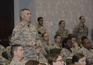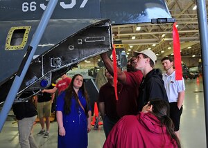 Col. Charlan Poirson, 340th Flying Training Group Commander, Randolph Air Force Base, Texas, passes the 43rd Flying Training Squadron guidon to Lt. Col. Brent Drown, the new 43rd FTS Commander, during a change of command ceremony April 22 at Columbus Air Force Base, Mississippi. (U.S. Air Force